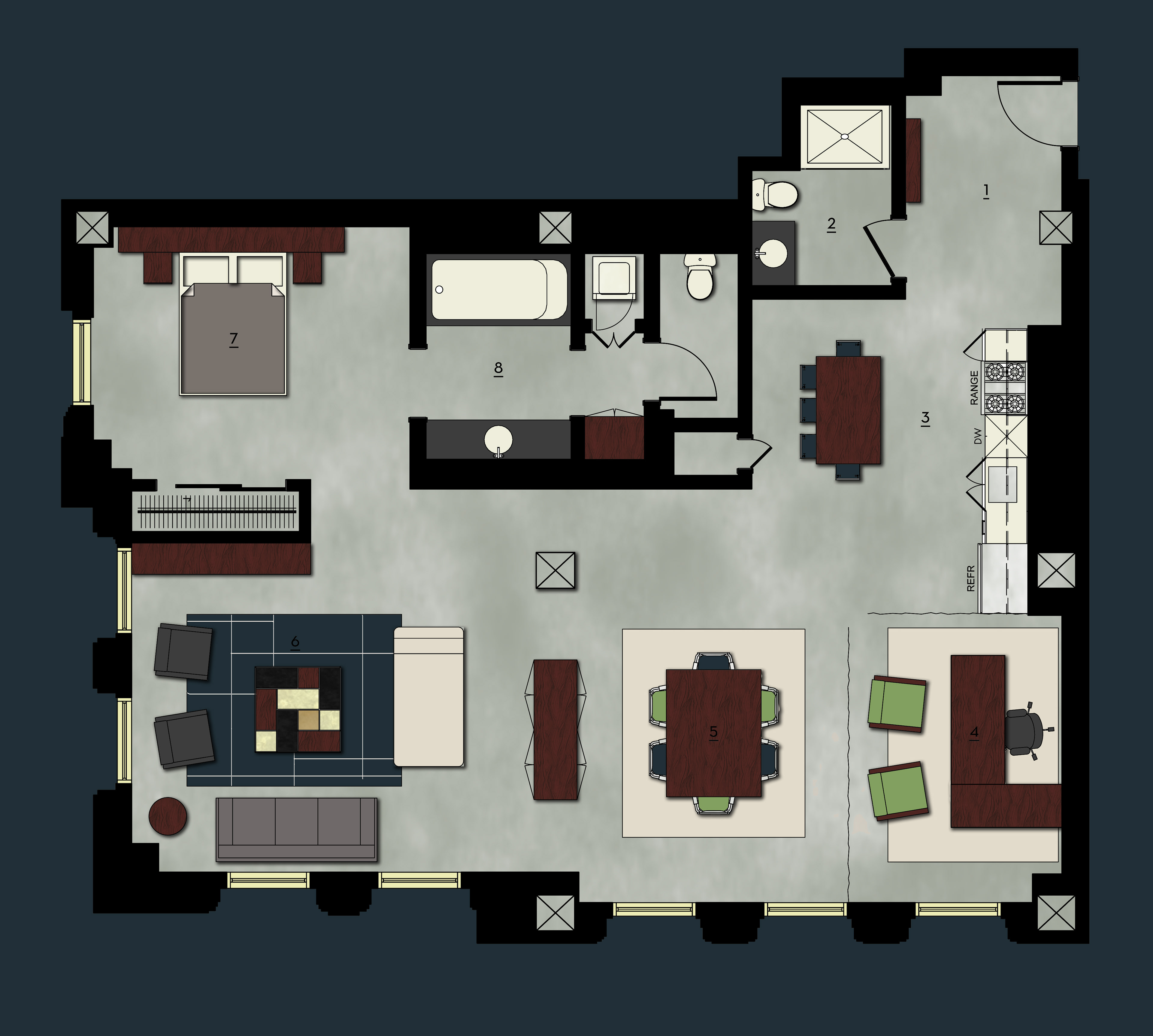 A postmodern mix of traditional details and clean lines, balanced with a decidedly masculine palette, redefine elegance for actor, comedian, and television host ANT in the KOR Group’s historic Eastern Columbia Lofts.